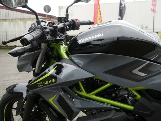 Mit Kawasakis einzigartiger Sugomi-Designphilosophie, die sofort ins Auge fällt, präsentiert sich das kleinste Mitglied der Z-Familie. Auffallen und ein starkes Naked-Bike-Statement setzen endash genau dafür ist sie da. Der freiliegende Gitterrohrrahmen verbindet sich mit der minimalistischen, aggressiven Z-Verkleidung und lädt zu sportlicher Fahrweise ein. Der 15-PS-Motor (11 kW) ist sowohl einsteigerfreundlich als auch so sportlich, wie man es von Kawasaki erwartet. Die Z125 kann mit dem A1-Führerschein oder mit dem Autoführerschein ab 25 Jahren (B196) gefahren werden und bietet ideale Voraussetzungen für Führerschein-Neulinge.